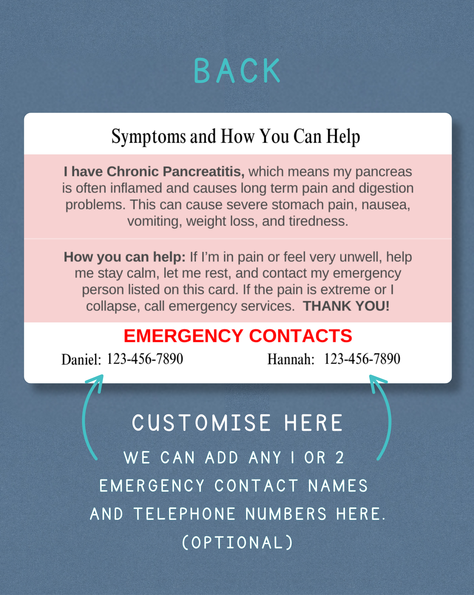 Back: A short explanation of your condition, what to do, and two emergency contact numbers
