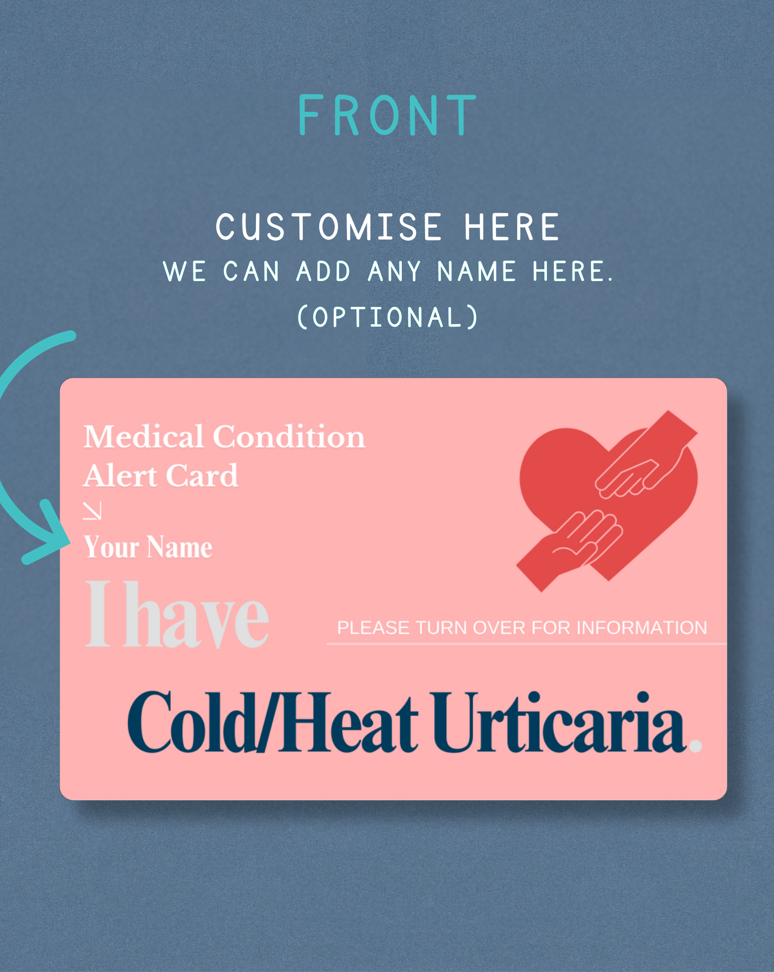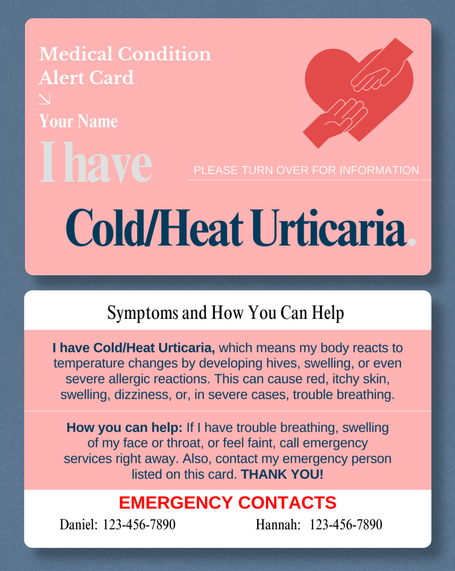 Back: A short explanation of your condition, what to do, and two emergency contact numbers