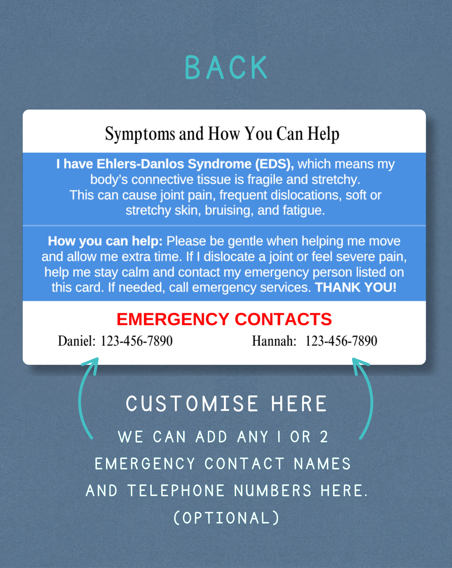 Back: A short explanation of your condition, what to do, and two emergency contact numbers