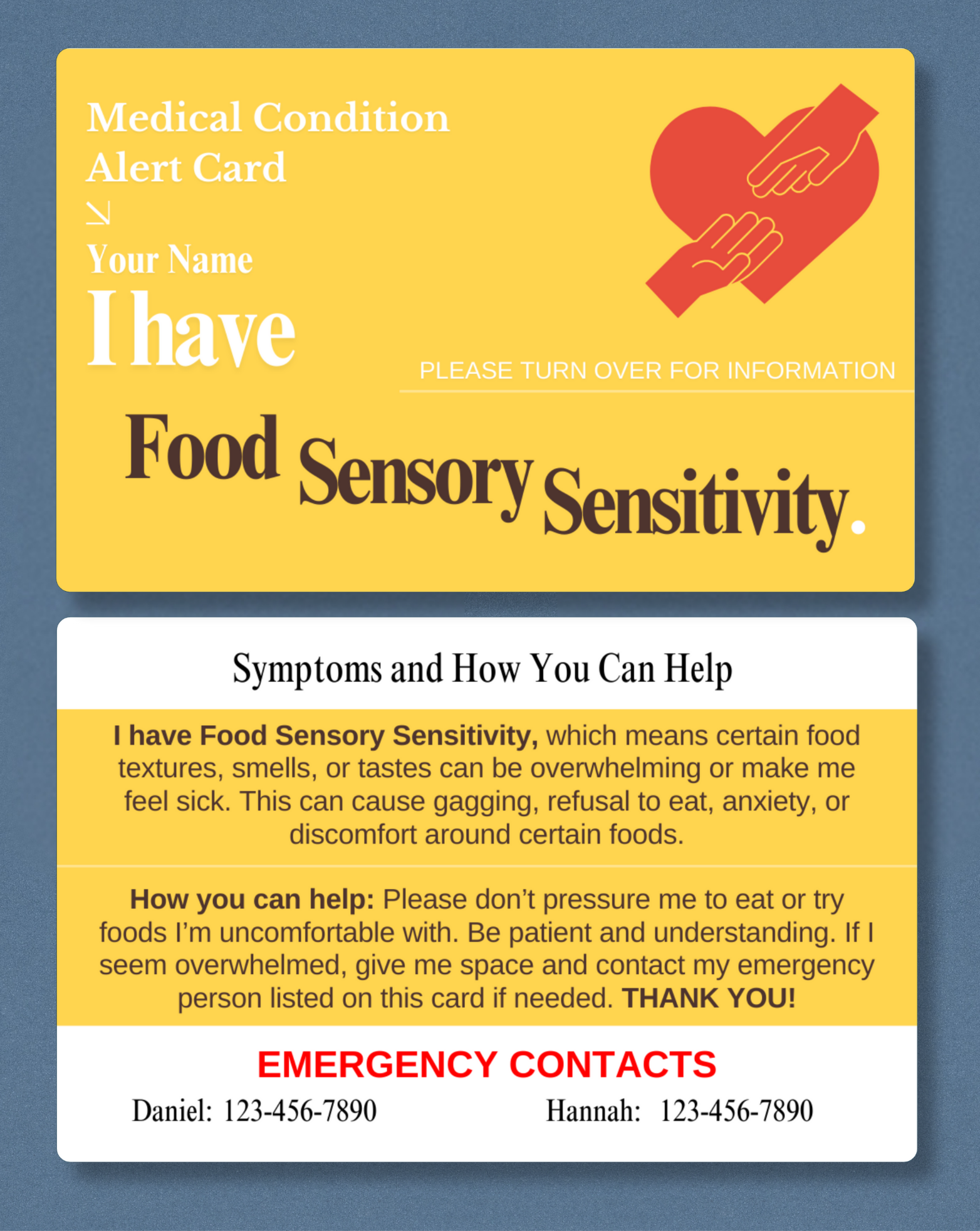 Back: A short explanation of your condition, what to do, and two emergency contact numbers