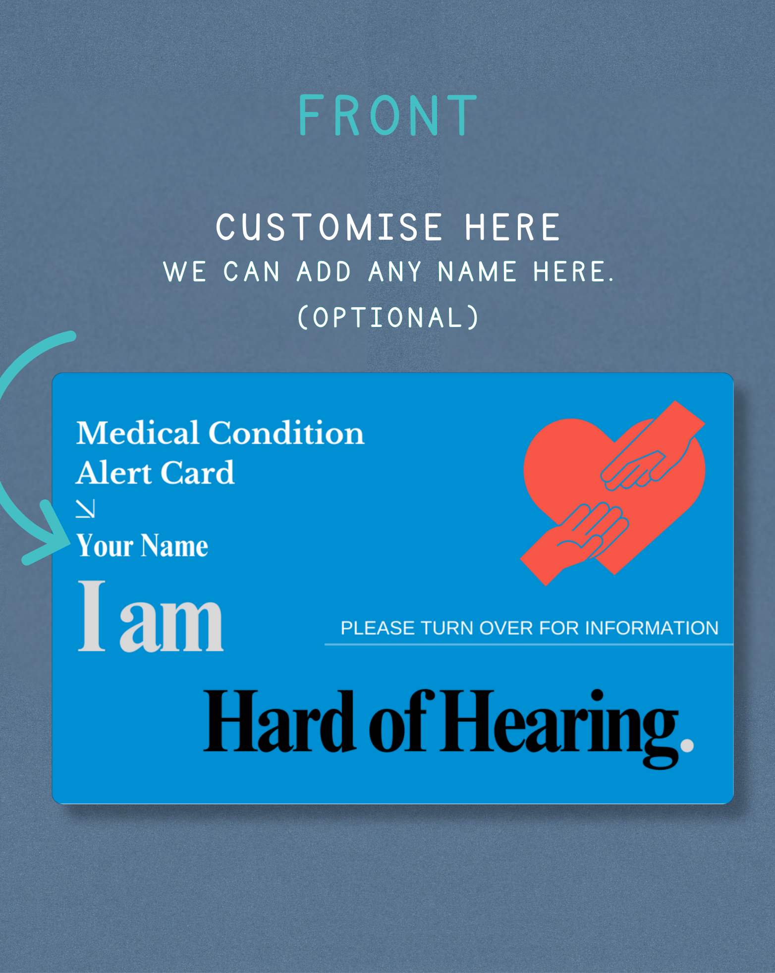 Back: A short explanation of your condition, what to do, and two emergency contact numbers