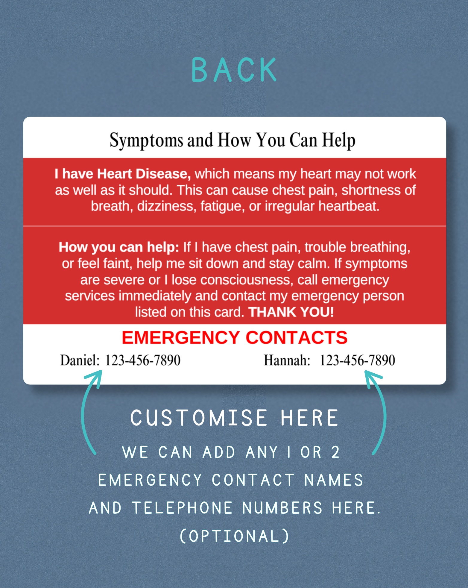 Back: A short explanation of your condition, what to do, and two emergency contact numbers