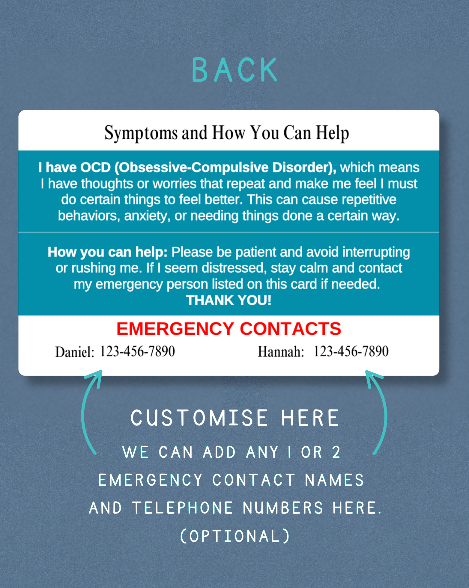 Back: A short explanation of your condition, what to do, and two emergency contact numbers