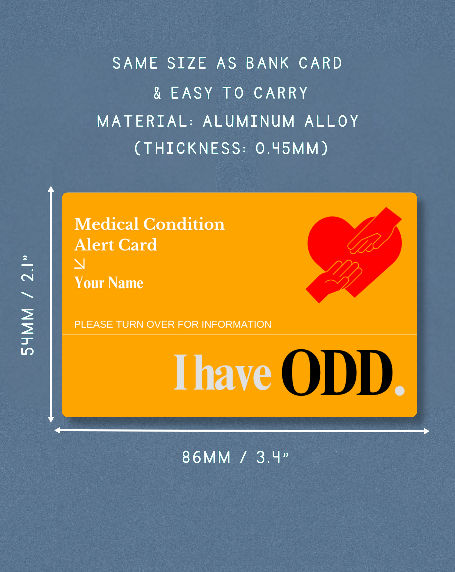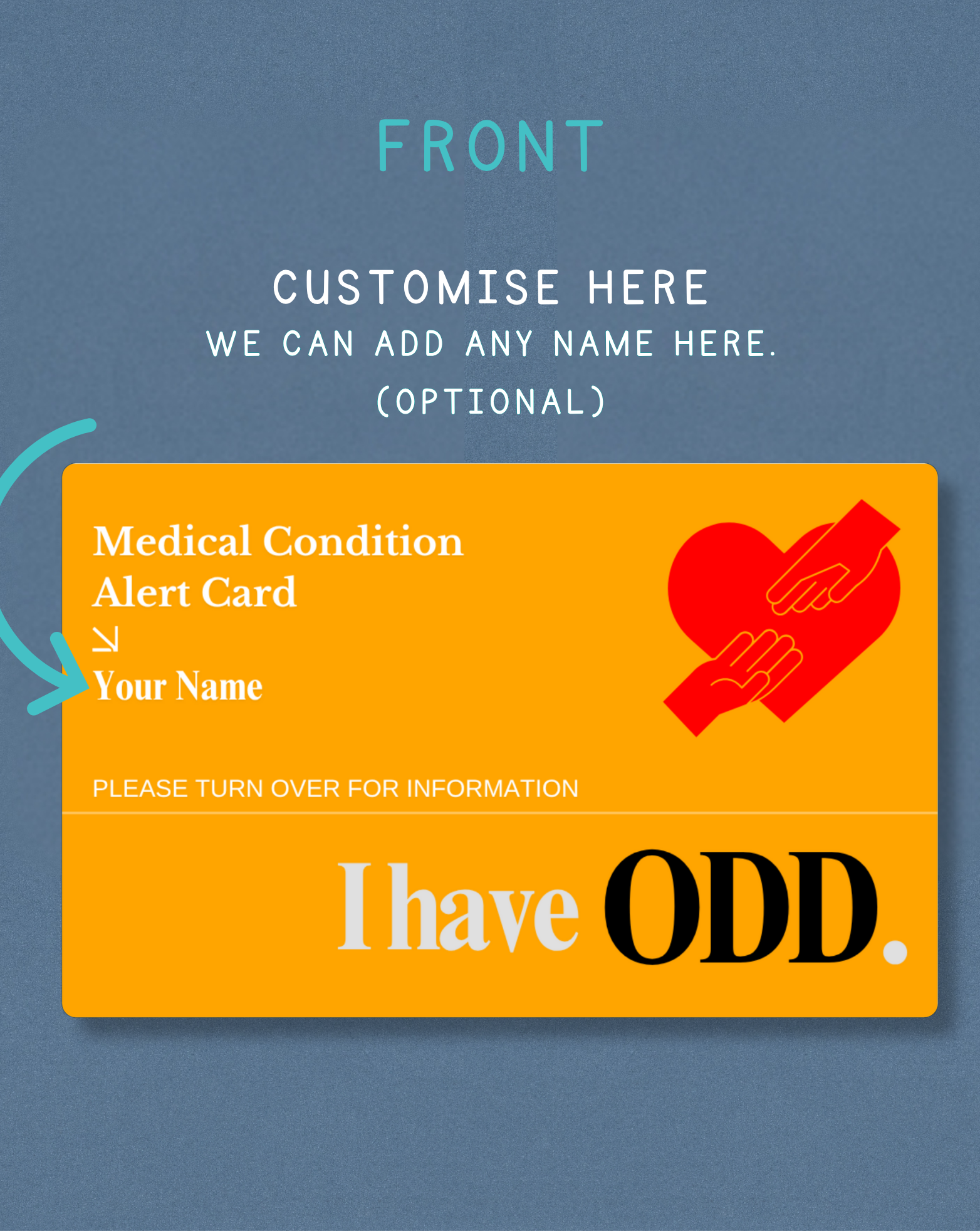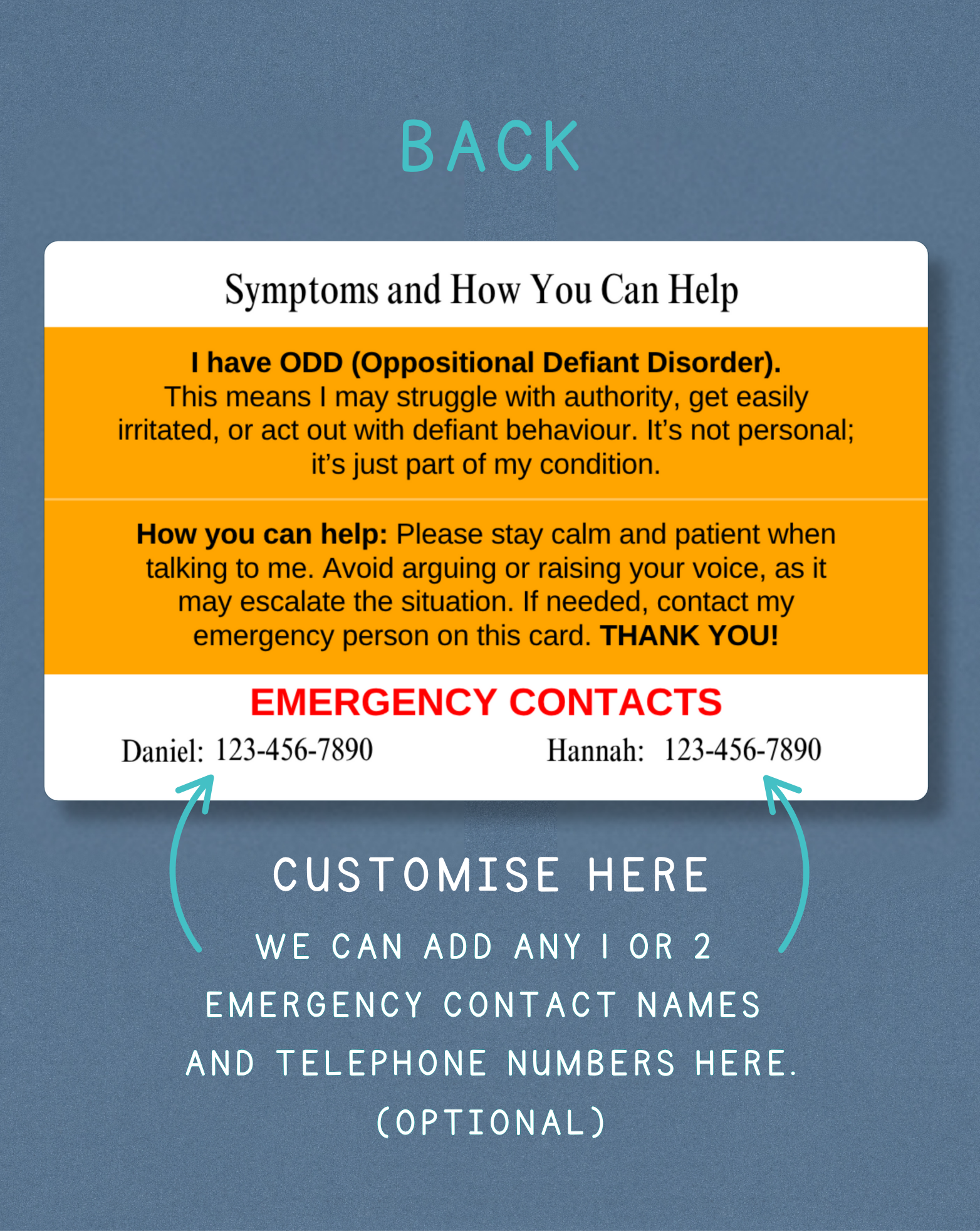 Back: A short explanation of your condition, what to do, and two emergency contact numbers